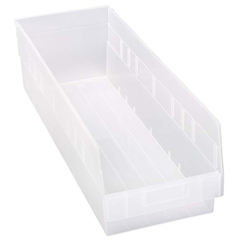 Maximize your storage space with durable, high density tri-clear polypropylene bins. Quantum's STORE-MORE 6"H Shelf Bins are the industry standard for quality. These bins feature a molded-in label holder, built-in rear hang-lock which allows bins to tilt out for complete access when on shelving. A wide hopper front allows complete access to the contents of the bin. Edges are reinforced for added strength. The designed for shelving units, racks or standard shelving. Optional dividers are a perfect solution to create a par level system. Bins are waterproof and corrosion-free.