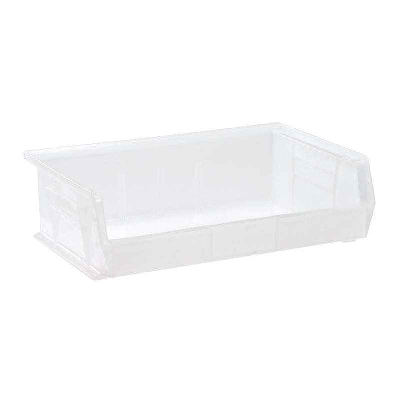 The QUS245CL Clear-View Ultra hang and stack bin is tough and durable. It can be used to organize your inventory.