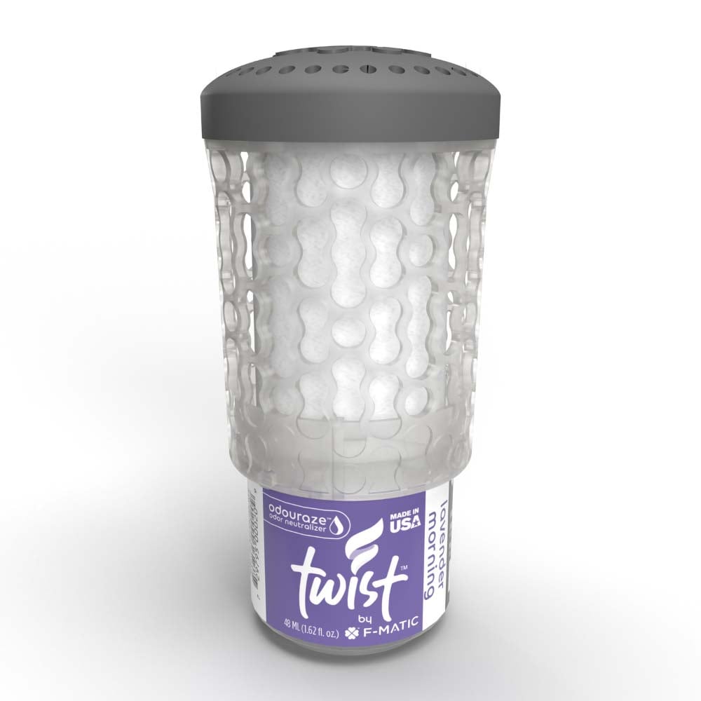 Promote a calming, spa-like environment with the Twist Lavender Morning 60-day passive refill. Featuring the relaxing floral aroma of fresh lavender, it's perfect for wellness centers, office restrooms, and healthcare facilities where a soothing, odor-free environment is key. Compatible with Twist dispensers, it provides long-lasting, battery-free performance for 60 days. Compatible with the AirFin Urinal Screen and Toilet Bowl AirClip.
