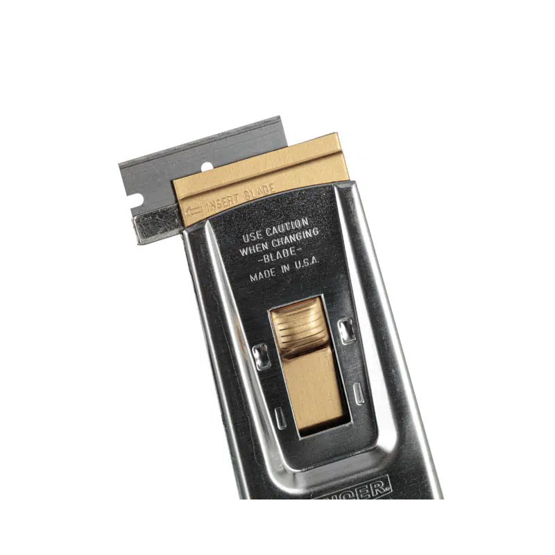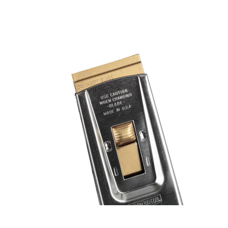 The ErgoTec Stainless Steel Safety Scraper is a durable, compact tool designed for tough cleaning tasks. Built from corrosion-resistant stainless steel, this scraper is ideal for removing paint, stickers, adhesives, and other residues from glass, metal, and smooth surfaces. Its slim profile makes it easy to carry in a pocket, tool belt, or janitorial cart, while the simple slide-out blade design provides safe handling and quick blade changes. Compatible with standard #9 (1½") razor blades (sold separately), this scraper is an essential tool for professional cleaners, contractors, and maintenance crews.