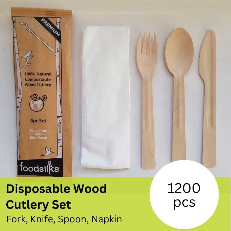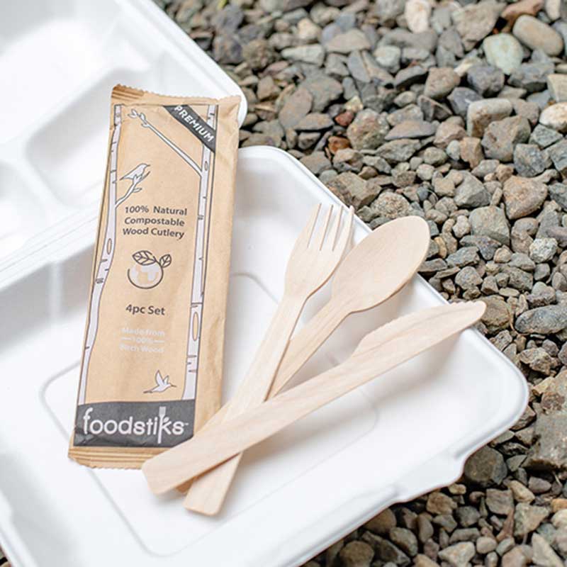 FOODSTIKS Compostable Wood Cutlery is an award-winning sustainable alternative to disposable plastic cutlery. 100% Natural, 100% Renewable and 100% (Backyard) Compostable. Our Foodservice packaging is ideal for any foodservice operator from food truck to multi chain. The 4 piece set comes with a fork, a knife, a spoon and a napkin. The PREMIUM cutlery has some improved characteristics over the standard cutlery like longer and sharper tines on the fork, a larger spoon head and reinforced handles on all 3. The case comes with 6 cartons of 200 sets for a total of 1,200. Made exclusively from Natural Birch wood the cutlery will compost in any setting, even if inadvertently left at a park or the beach. Bring your sustainability on and show your customers that you care about our planet. 100% Sustainable - 100% Satisfaction!