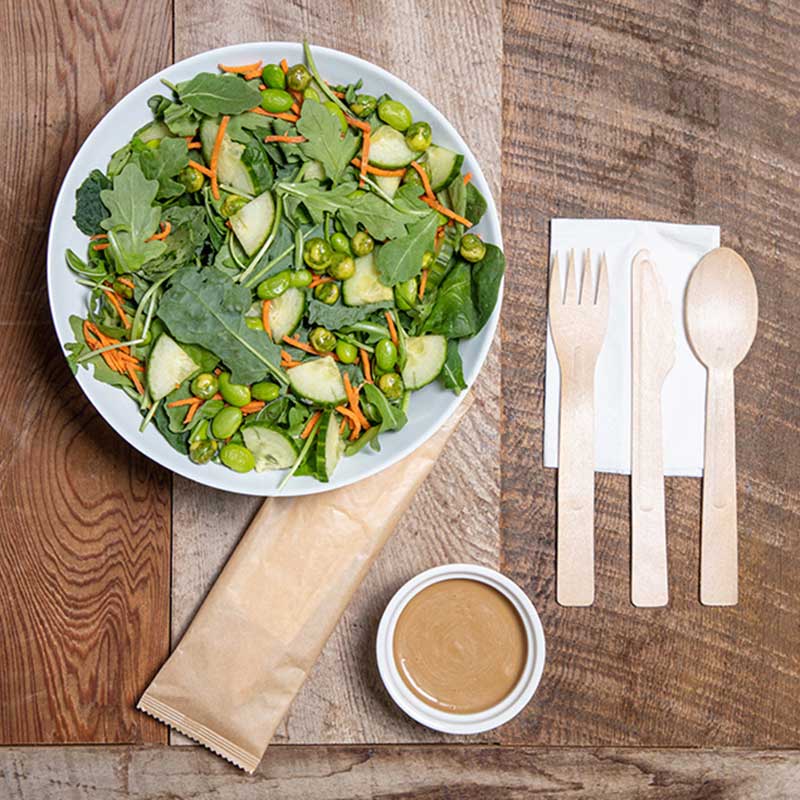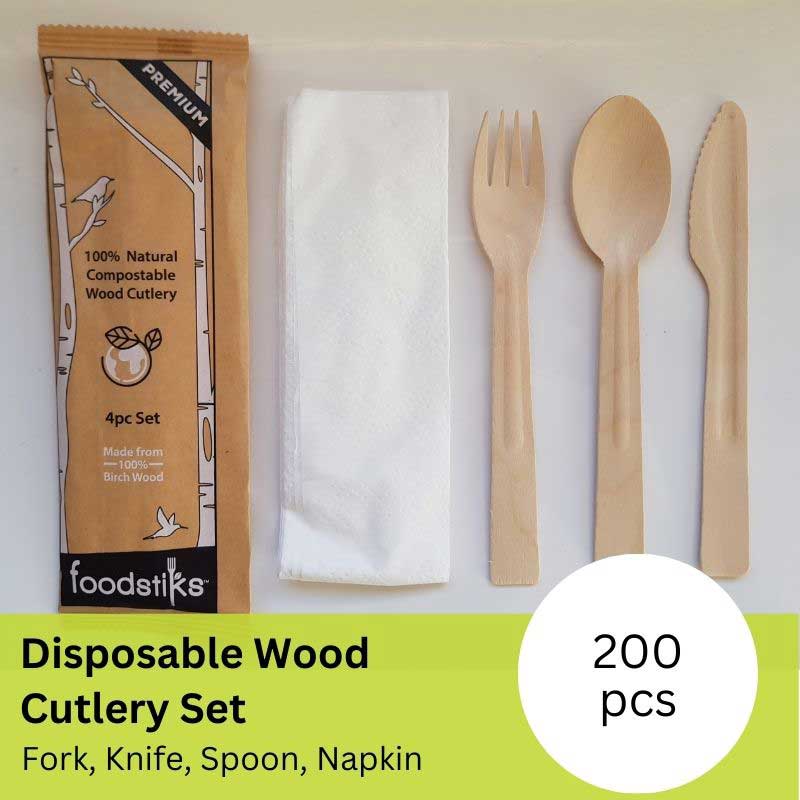 FOODSTIKS Compostable Wood Cutlery is an award-winning sustainable alternative to disposable plastic cutlery. 100% Natural, 100% Renewable and 100% (Backyard) Compostable. Our Foodservice packaging is ideal for any foodservice operator from food truck to multi chain. The 4 piece set comes with a fork, a knife, a spoon and a napkin. The PREMIUM cutlery has some improved characteristics over the standard cutlery like longer and sharper tines on the fork, a larger spoon head and reinforced handles on all 3. The carton comes with 200 sets. Made exclusively from Natural Birch wood the cutlery will compost in any setting, even if inadvertently left at a park or the beach. Bring your sustainability on and show your customers that you care about our planet. 100% Sustainable - 100% Satisfaction!